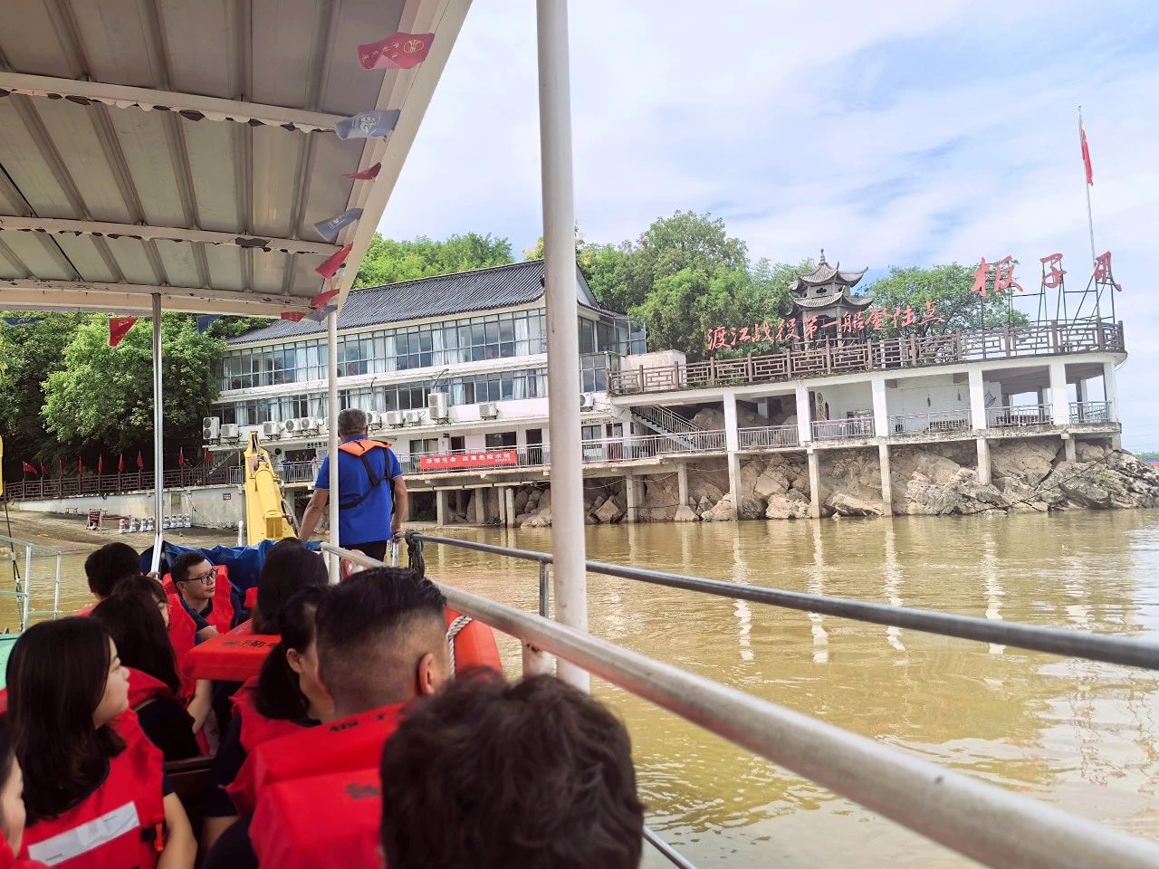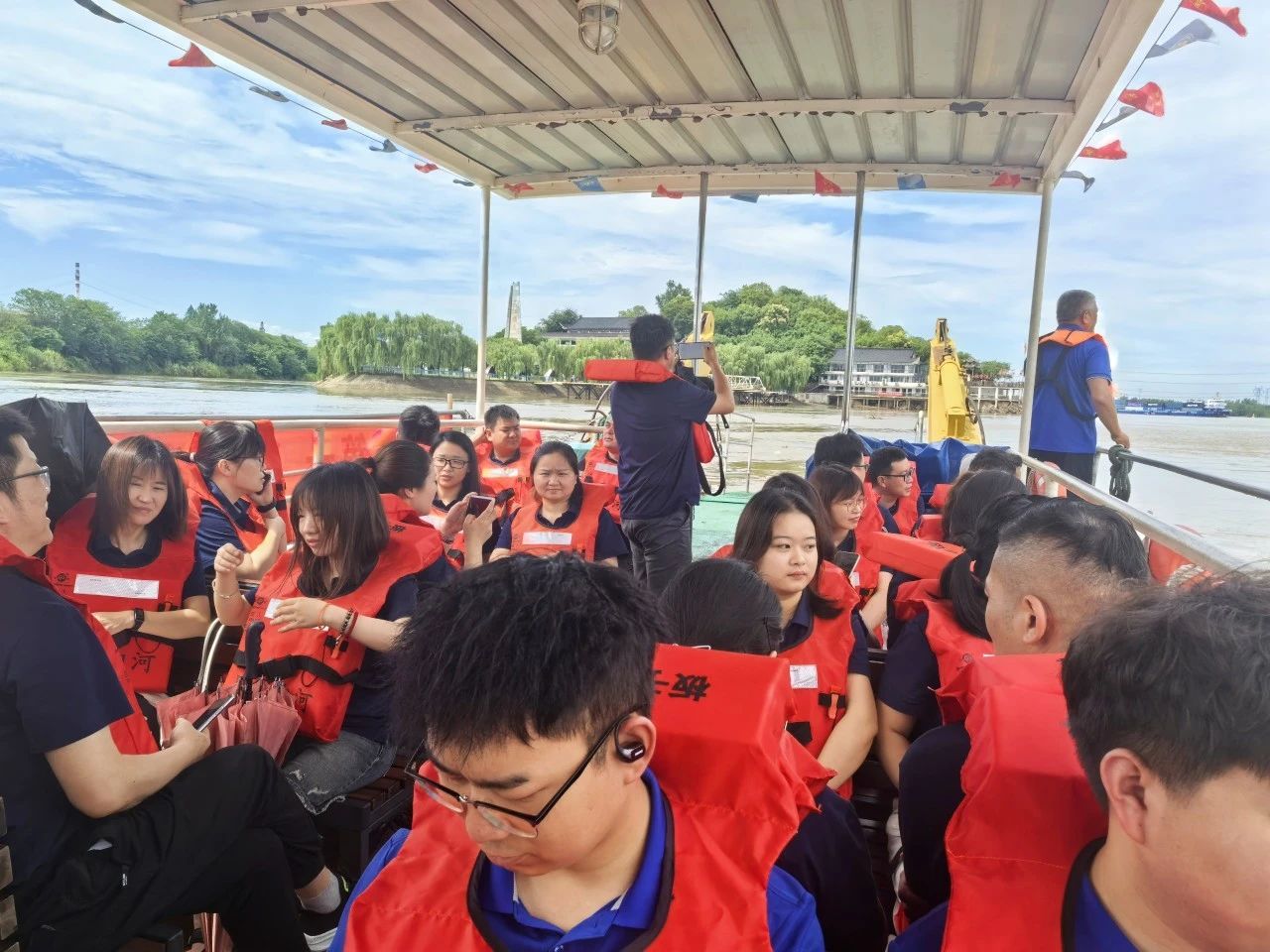 上午9時(shí),全體黨員身著廠服、佩戴黨徽,在游船碼頭整齊列隊(duì)登船前往渡江戰(zhàn)役第一船登陸點(diǎn)——板子磯。江風(fēng)獵獵,碧波蕩漾,黨員們遙望這片見證過歷史性時(shí)刻的江面,仿佛置身于76年前百萬雄師橫渡長江的壯闊場景中。